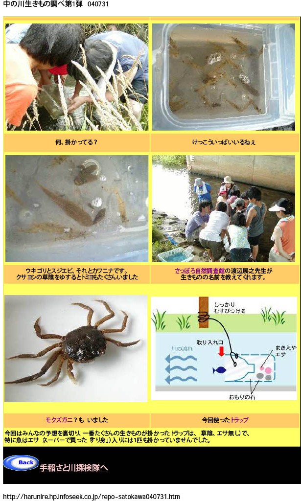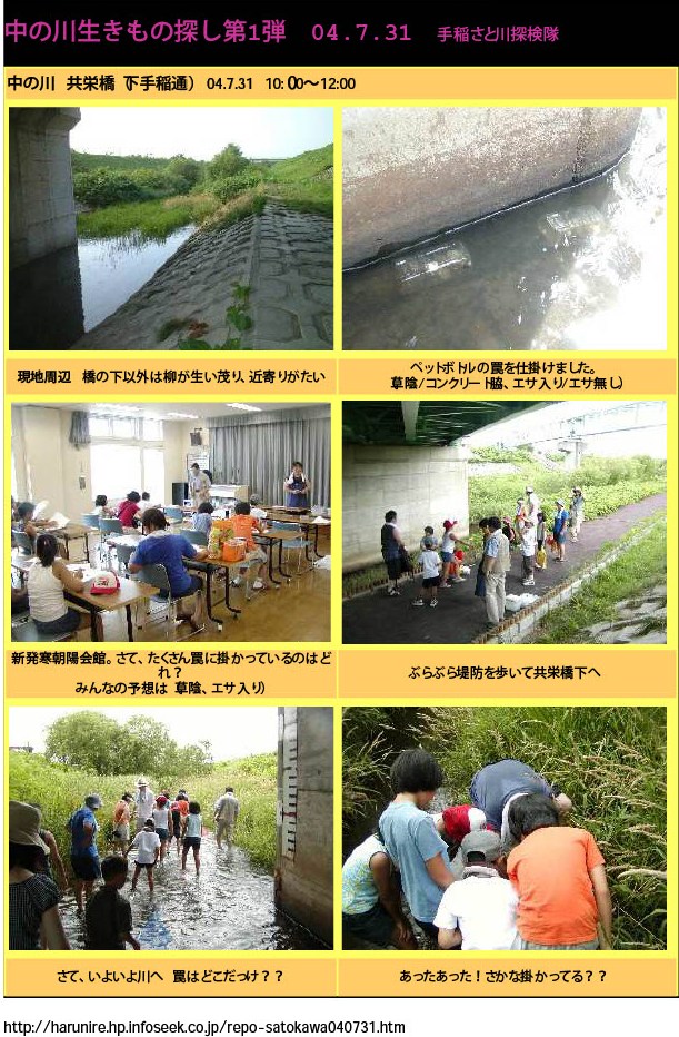 この第1回の「川の生きもの探し」こんな報告をUPしてました。(Web上にあったサイトは、その後消滅してしまいました…)