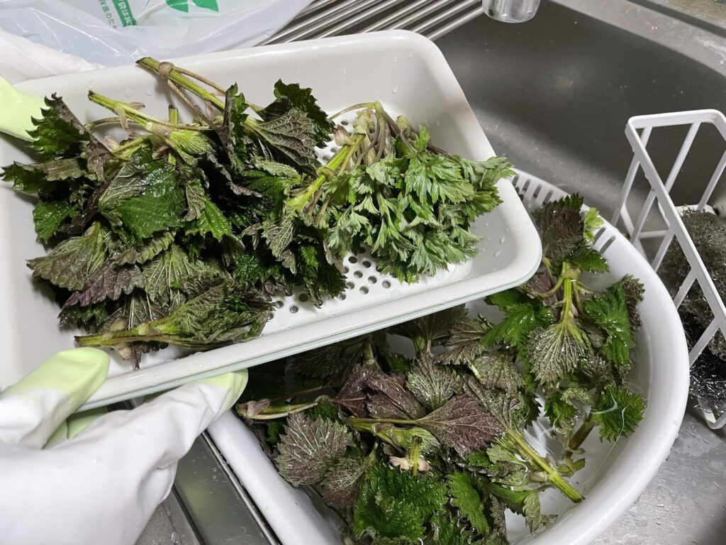 家に持ち帰って、サッと洗います。この時も手袋は必須。でもこのチクチク(茎にある棘に蟻酸があって、刺さると1日くらい不快)は、加熱でなくなりますので、ご安心を。