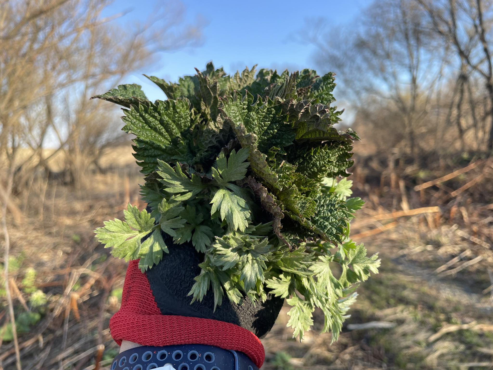 やわらかそうな新芽を少しだけ摘み、ついでに出始めたばかりのヨモギも少々。