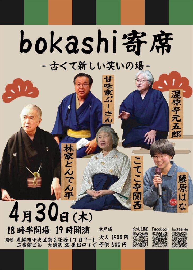 日本全国、桜も終わり、北海道にもいよいよ春来る卯月もつごもり、マジかよ早くもゴールデンウィーク!?だからか眠くて起きられないし、物価はどんどこ上がるだけ。先が見えない貴方も僕も、ストレス多くて沈みがちだが、あしたは明日、今日は今日!去年は去年、今年は今年!2026年丙午、春のひととき寄席で笑って、免疫力を高めませんか?と来たもんだ!